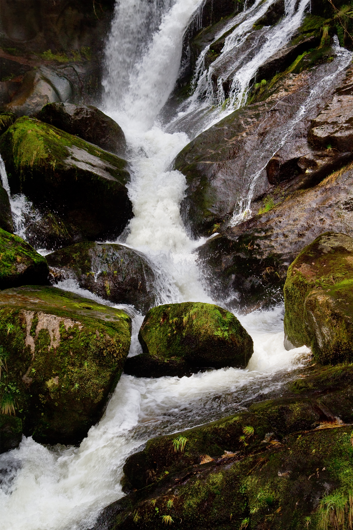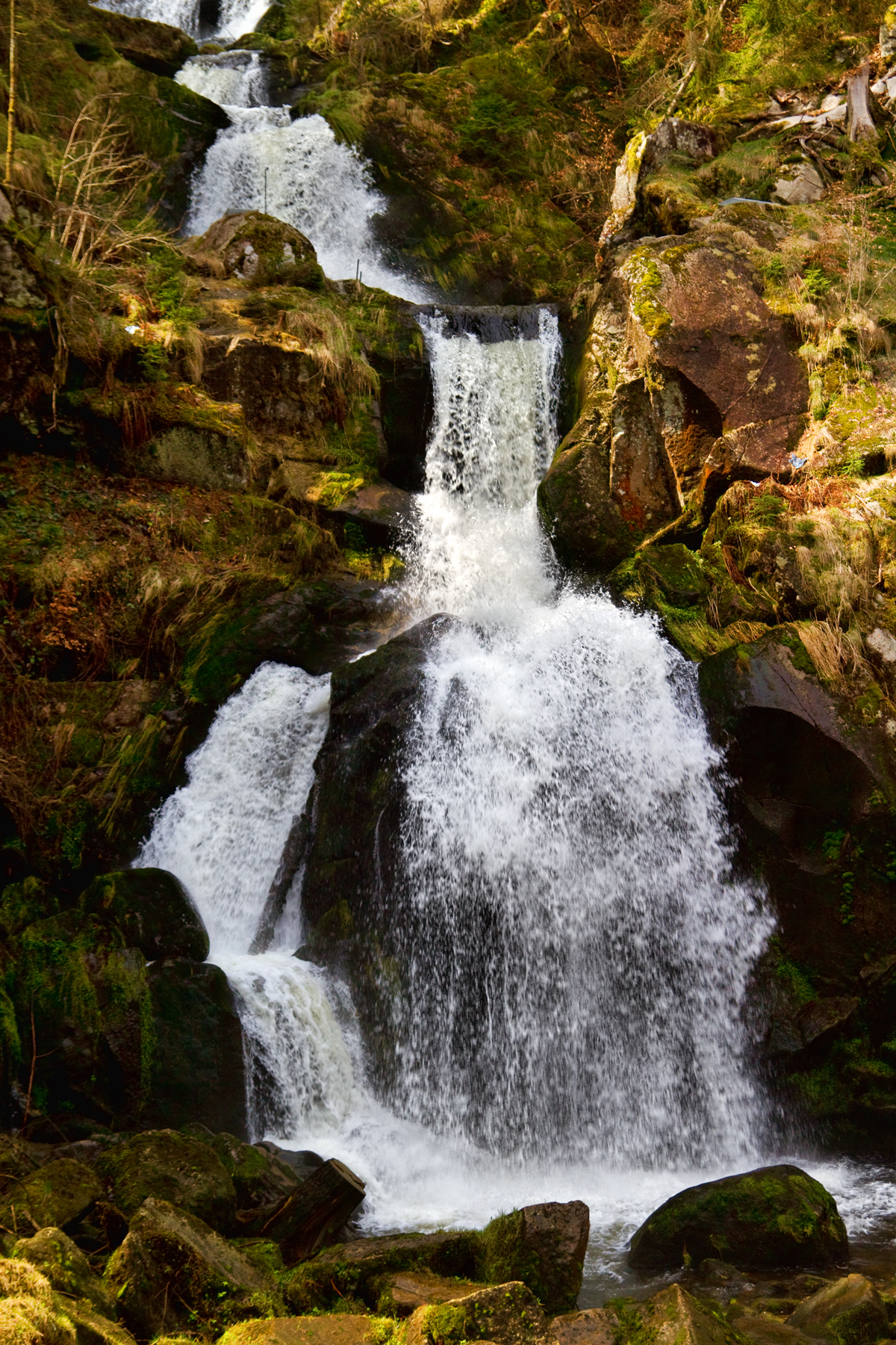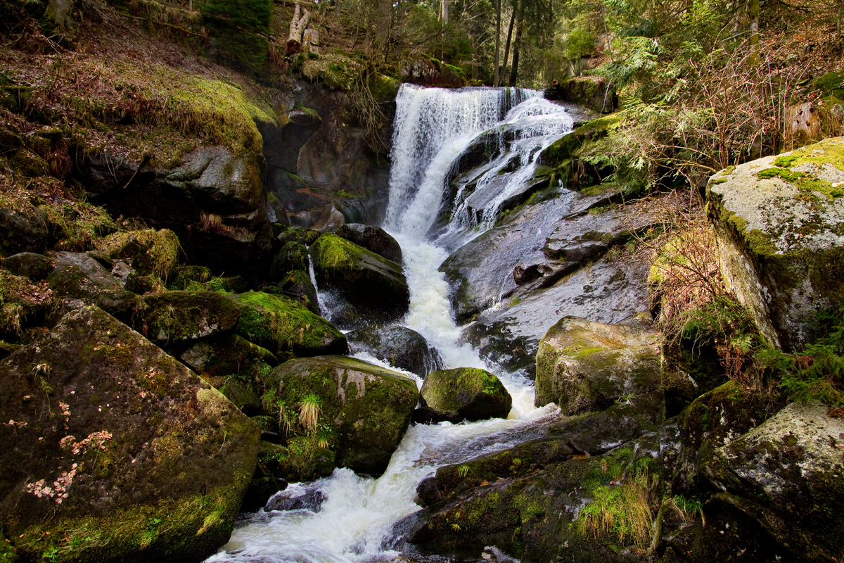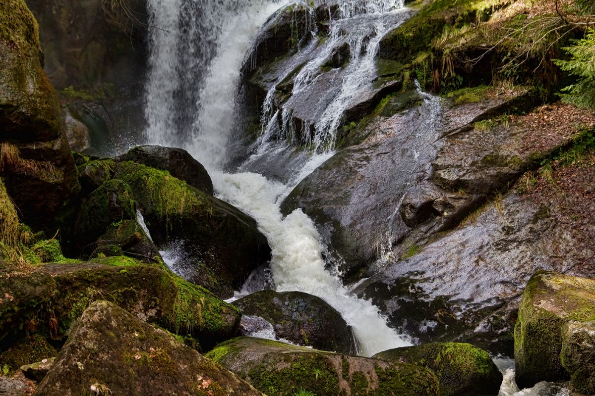 So war es natürlich nicht: Die Bilder entstanden an den „Triberger Wasserfällen”. Das Wetter war zwar ideal, dennoch waren die Bedingungen für gute Fotos nicht optimal. Durch die dichten Bäume war alles sehr schattig, dunkel und farblos — von der Sonne bestrahlte Bereiche wirkten schnell überbelichtet, vor allem das Wasser. Die Bilder wurden durch Überblendung von unterschiedlich belichteten RAW-Daten in Photoshop erstellt.