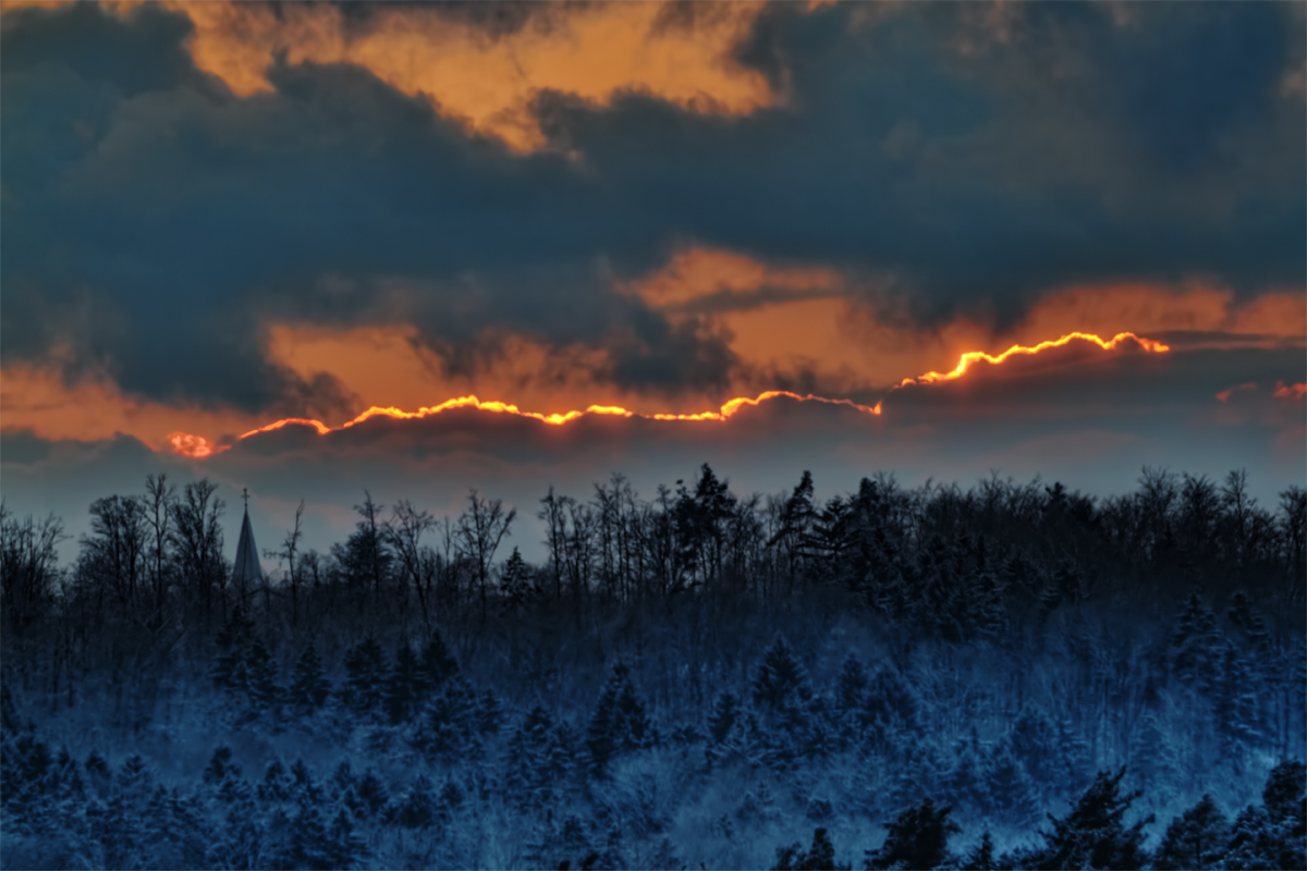 Dieser Anblick bot sich an einem kalten Januarabend. Der Sonnenuntergang bereits gelaufen und eigentlich gab es nichts mehr zu erwarten. Mehr und mehr zeigte sich dann aber dieser warme orangene Streifen, der sehr schön im Kontrast zu den kalten, schneebedeckten Bäumen, den dunklen Wolken und dem Nebel lag.