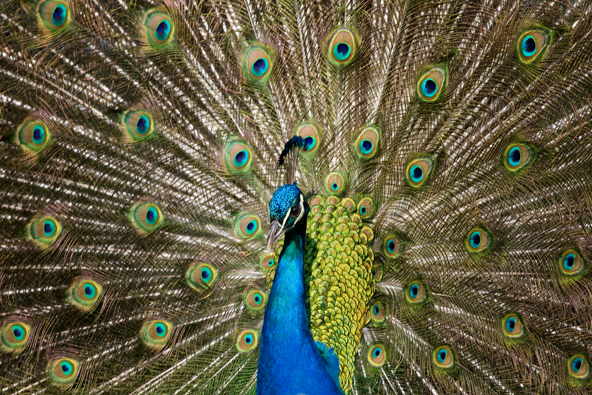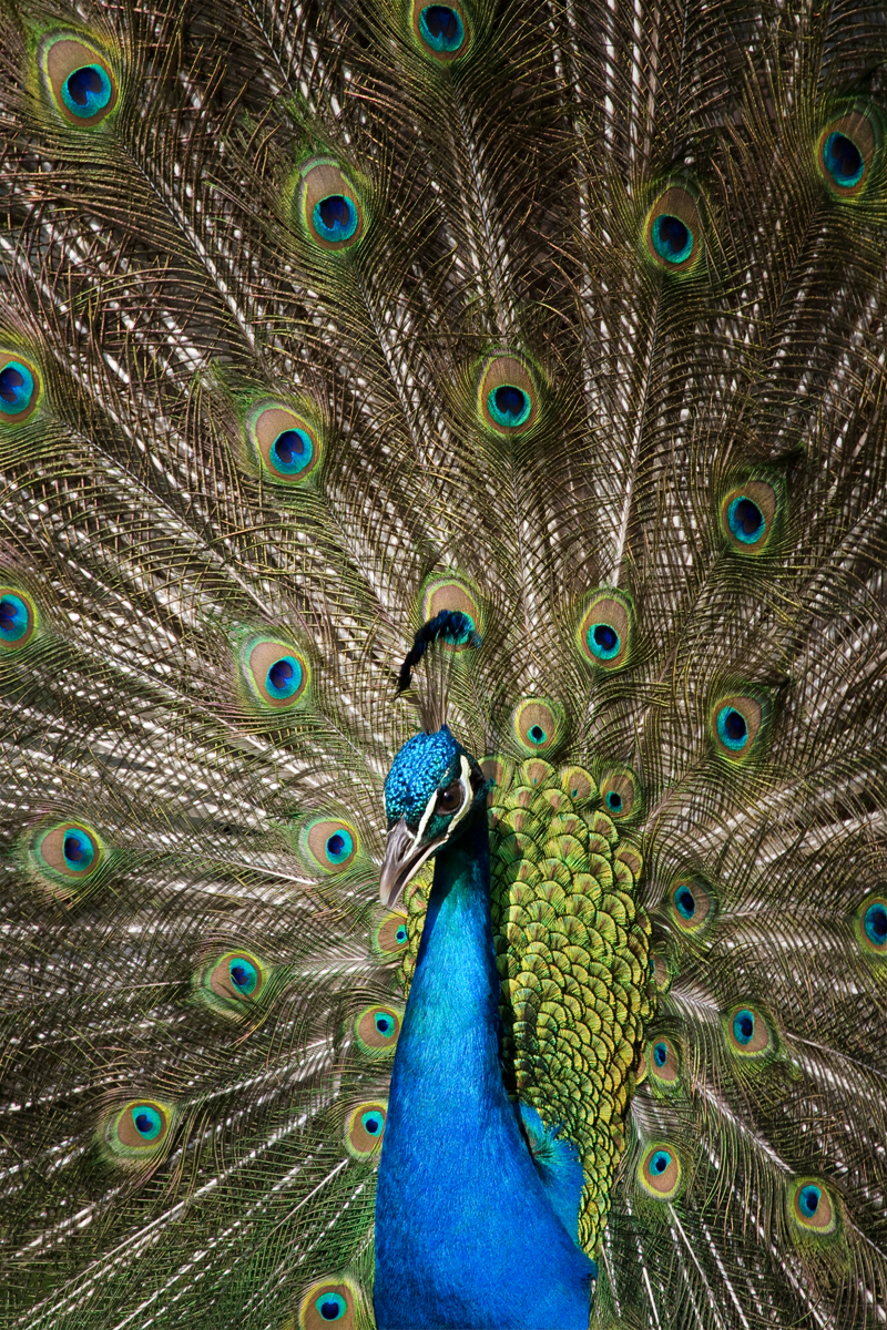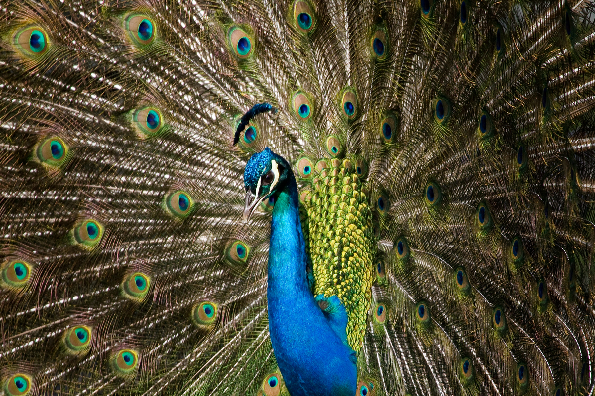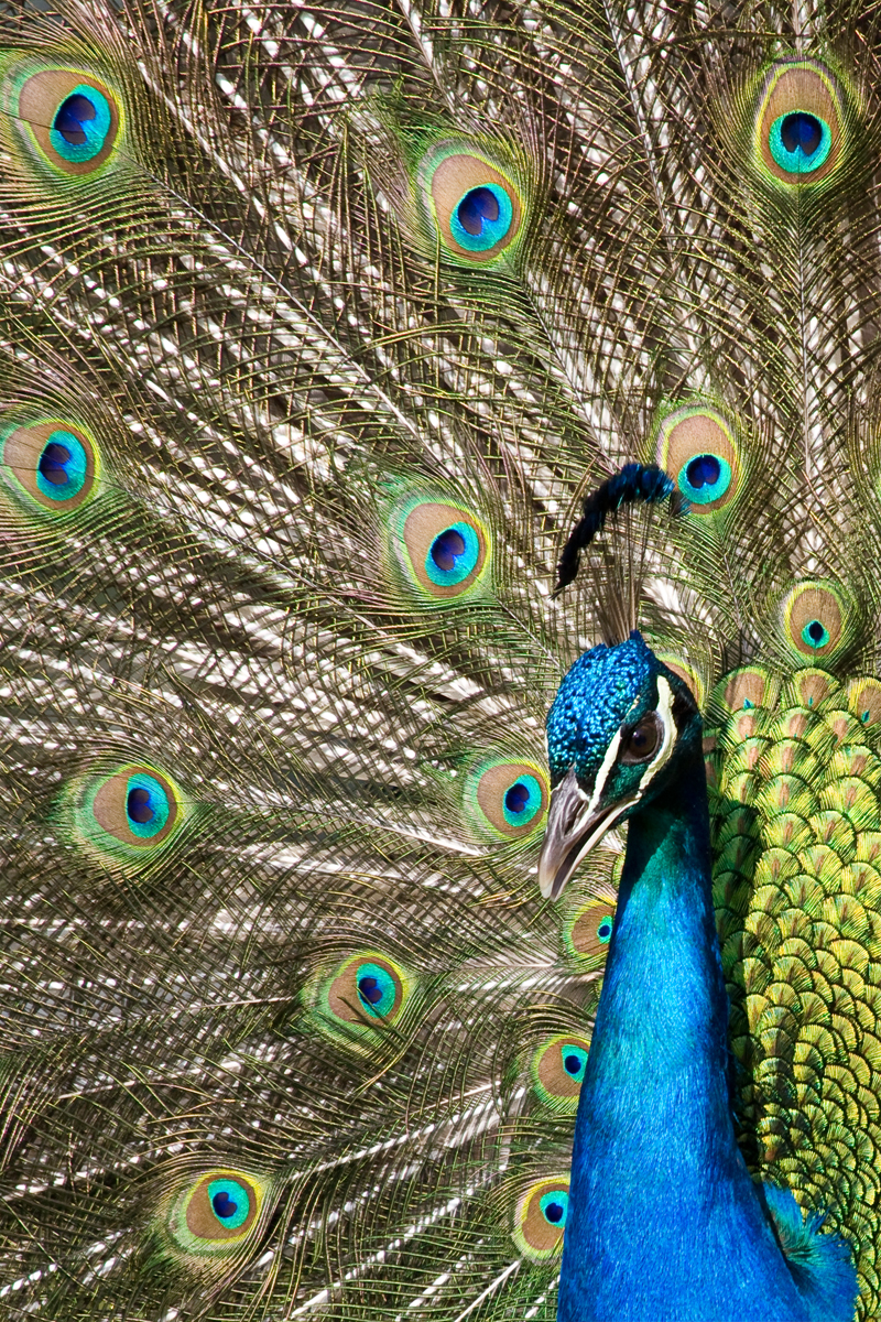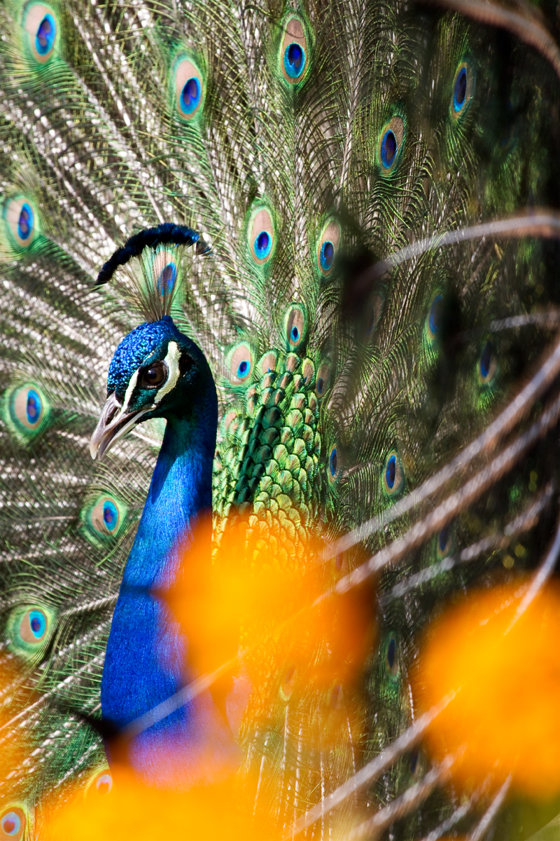 Man muss schon reich­lich Glück haben, um einen Pfau gerade im richti­gen Moment mit aufge­fä­cher­tem Rad fotogra­fie­ren zu können. An diesem Tag in der Wilhelma Stuttgart war es so und ich konnte einige Bilder dieses sehens­wer­ten Schauspiels erstel­len. Was Männchen nicht alles unter­neh­men, um Weibchen zu beein­dru­cken! Allerdings gab es auch einige Dinge, die die ganze Sache etwas schwie­ri­ger gemacht haben: Das Tier war ständig in Bewegung, die Pfauenhenne verdeck­te teilwei­se (wahrschein­lich zurecht) das Motiv, im Vordergrund befan­den sich an einigen Stellen ausge­trock­ne­te Blumen und ich war nicht der einzi­ge Fotograf…