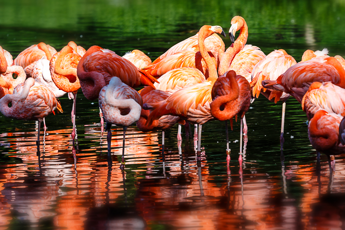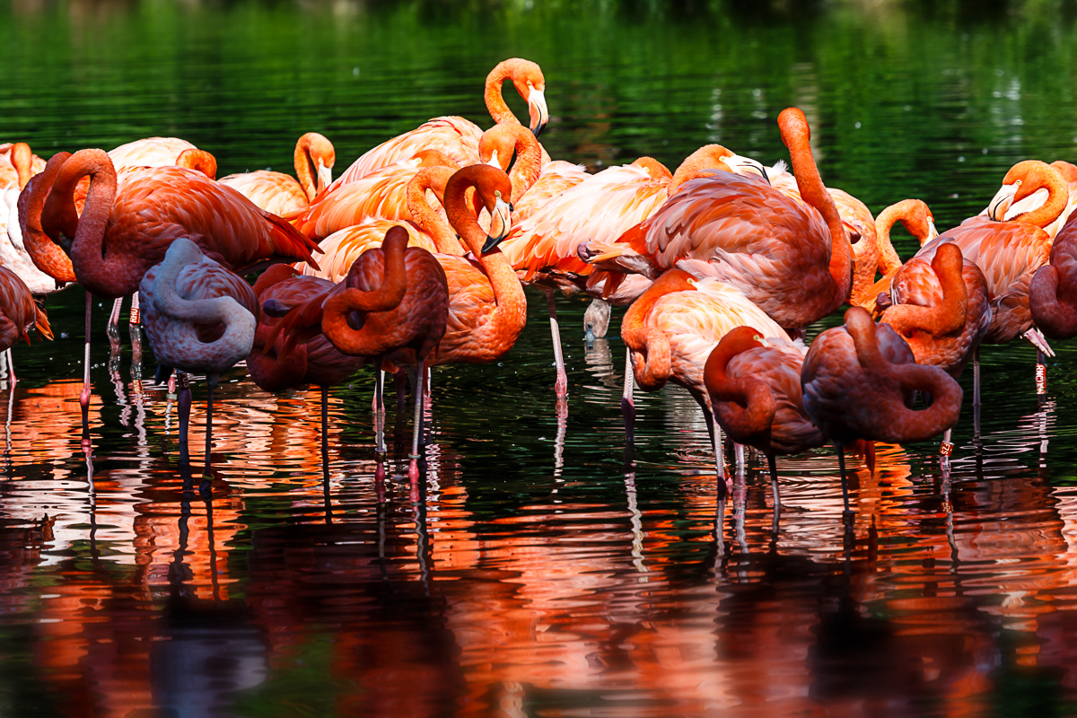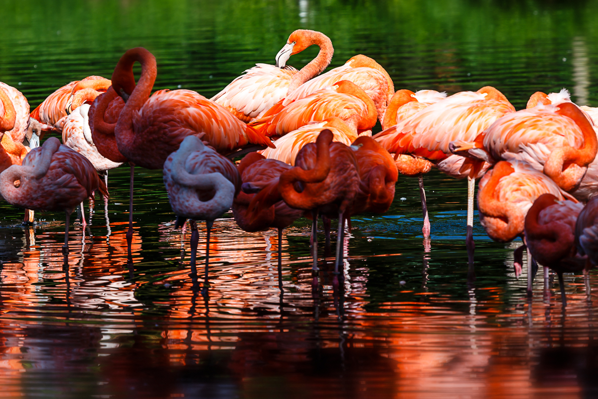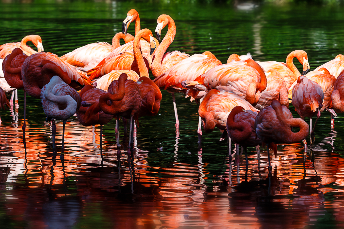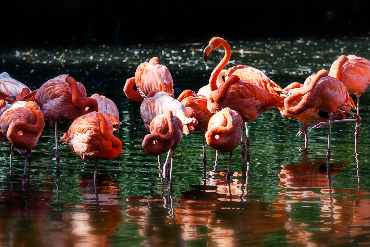 Diese Flamingos konnte ich letztes Jahr im Zoo in Heidelberg fotografieren. Da die Tiere hier mit Krebsen gefüttert werden, erhalten sie eine kräftigere Farbe, als beispielsweise die Exemplare in der Wilhelma. Ganz schön poppig, aber irgendwie interessant.