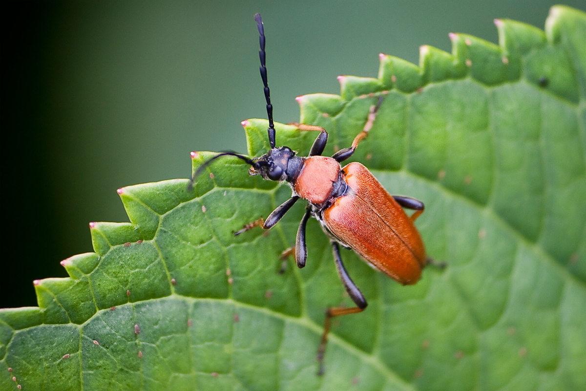 Als ich im Juli 2009 wieder mal auf der Jagd nach Schmetterlingen war, begenete mir dieser Käfer. Weil man ja nie genug Übung haben kann, fotografierte ich eine kleine Serie meines Gastes. Erst bei der Bearbeitung fiel mir auf, dass das Tierchen interessante Details hat. Nachdem ich bei der Bestimmung auch noch herausgefunden habe, dass es sich um ein Weibchen handelt, dachte ich mir: „Dich bringe ich groß heraus!” Das erhöhte Rauschen durch den ISO-Wert 640 konnte ich mit Hilfe der Software Topaz Denoise beinahe komplett entfernen.