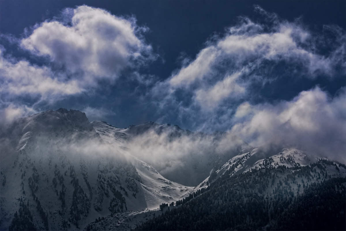Vom Skigebiet „Hochzeiger” (Österreich, Pitztal) aus hat man einen wunder­schö­nen Blick auf die umlie­gen­den Berge und Täler. An diesem Sonntag im März hingen die Wolken immer wieder länge­re Zeit über dem „kleinen Aifner” und sorgten so für diese Lichtverhältnisse.
