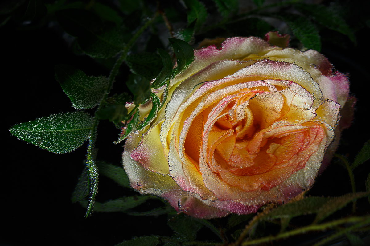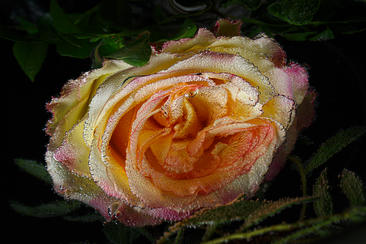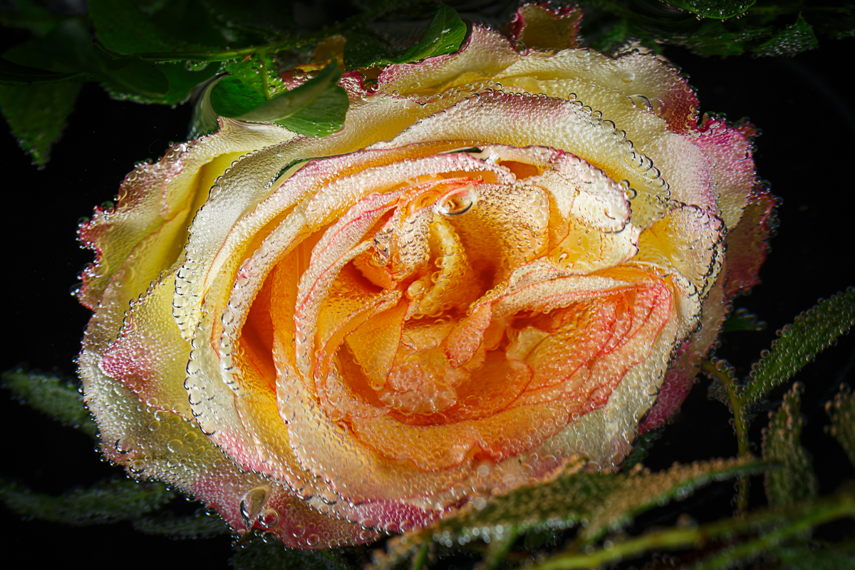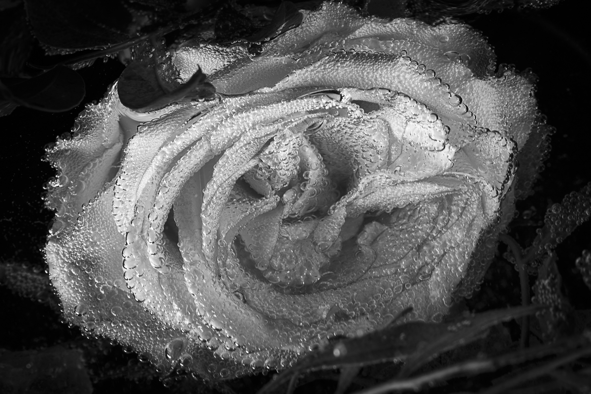 Bevor die Rose im Wasser versenkt wurde, (Unterwasserblumenland II) wollte ich auch einige „konven­tio­nel­le” Aufnahmen erstel­len. Dafür habe ich die Rose mit Wasser besprüht, was die Bilder meiner Meinung nach etwas inter­es­san­ter oder außer­ge­wöhn­li­cher macht. Die Fotos entstan­den mit einem Canon Extension Tube EF25 II (Makrozwischenring) und dem Canon EF50mm ƒ1.4 USM.
