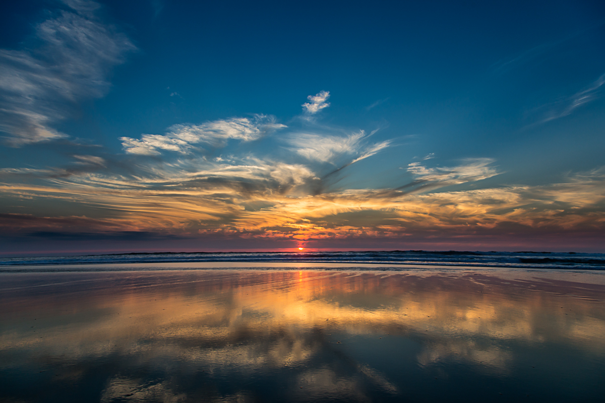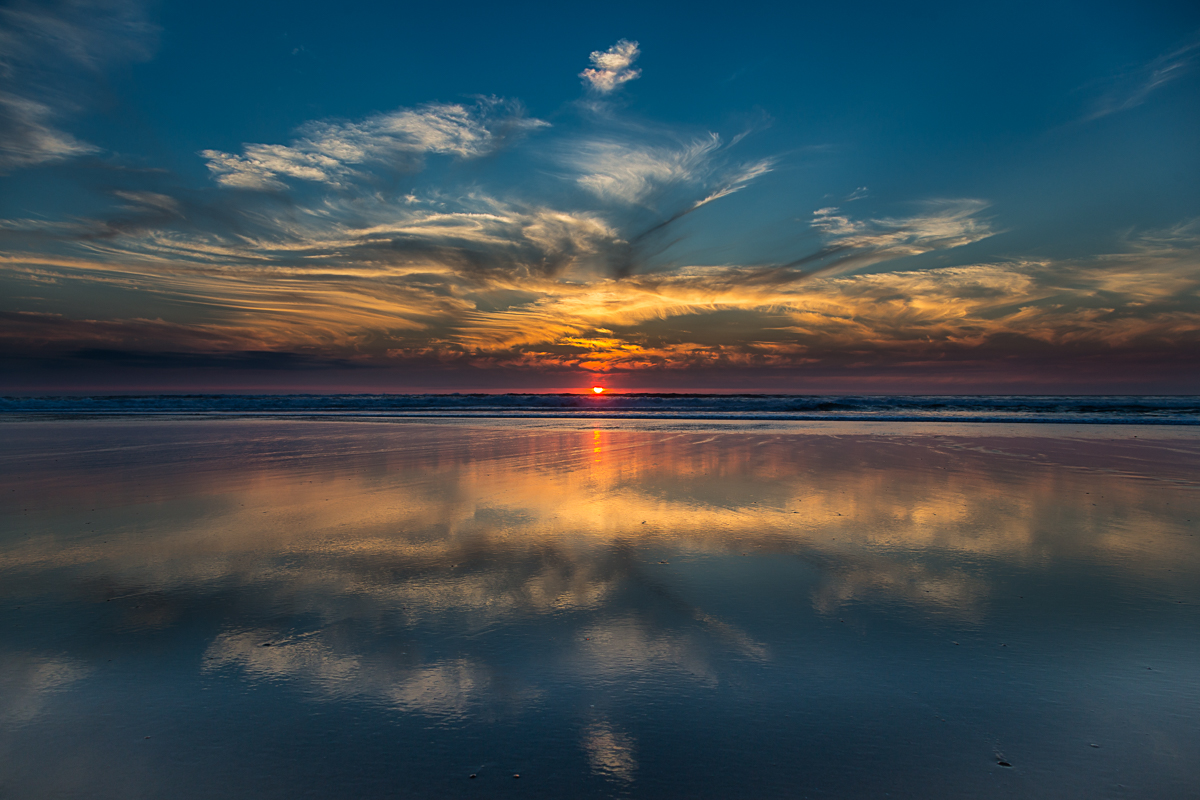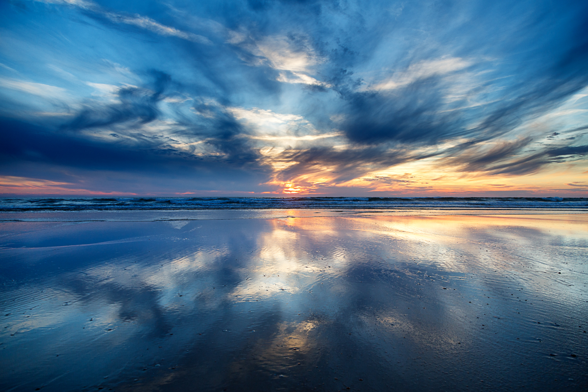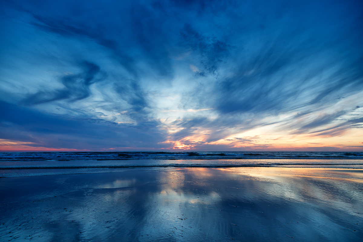 Aus der unend­li­chen Reihe meiner Strandbilder: Es gibt diese Abende, an denen alles noch etwas klarer erscheint — Himmel, Wolken, Horizont, Wasser, Spiegelungen sogar der Sand sieht irgend­wie feiner und glatter aus. Ich habe keine Ahnung, wie die Natur es erreicht, aber es passt alles zusam­men. Hier hatte ich auch schon mal diesen Eindruck…