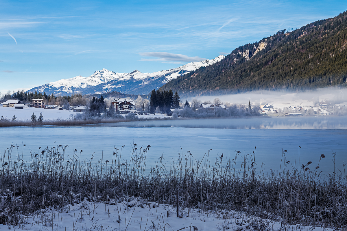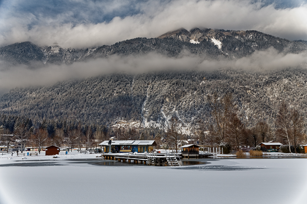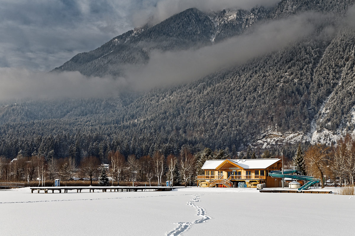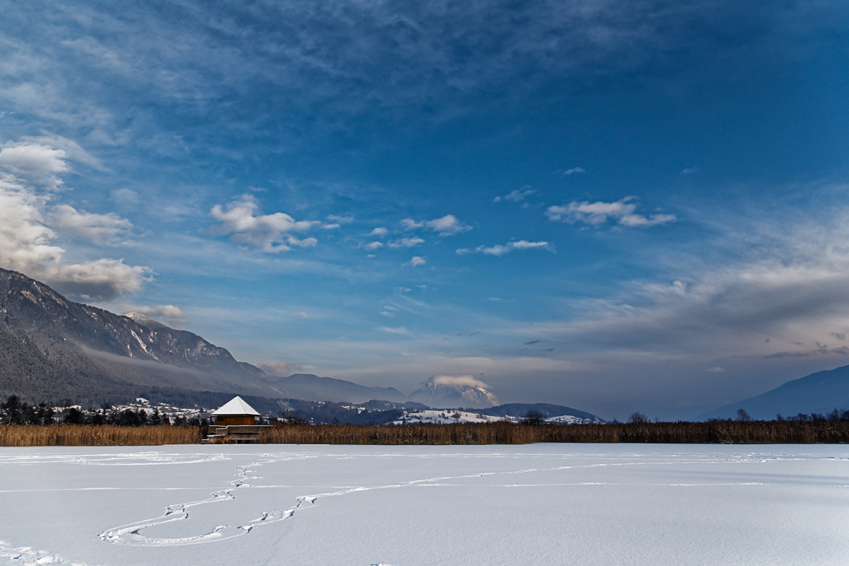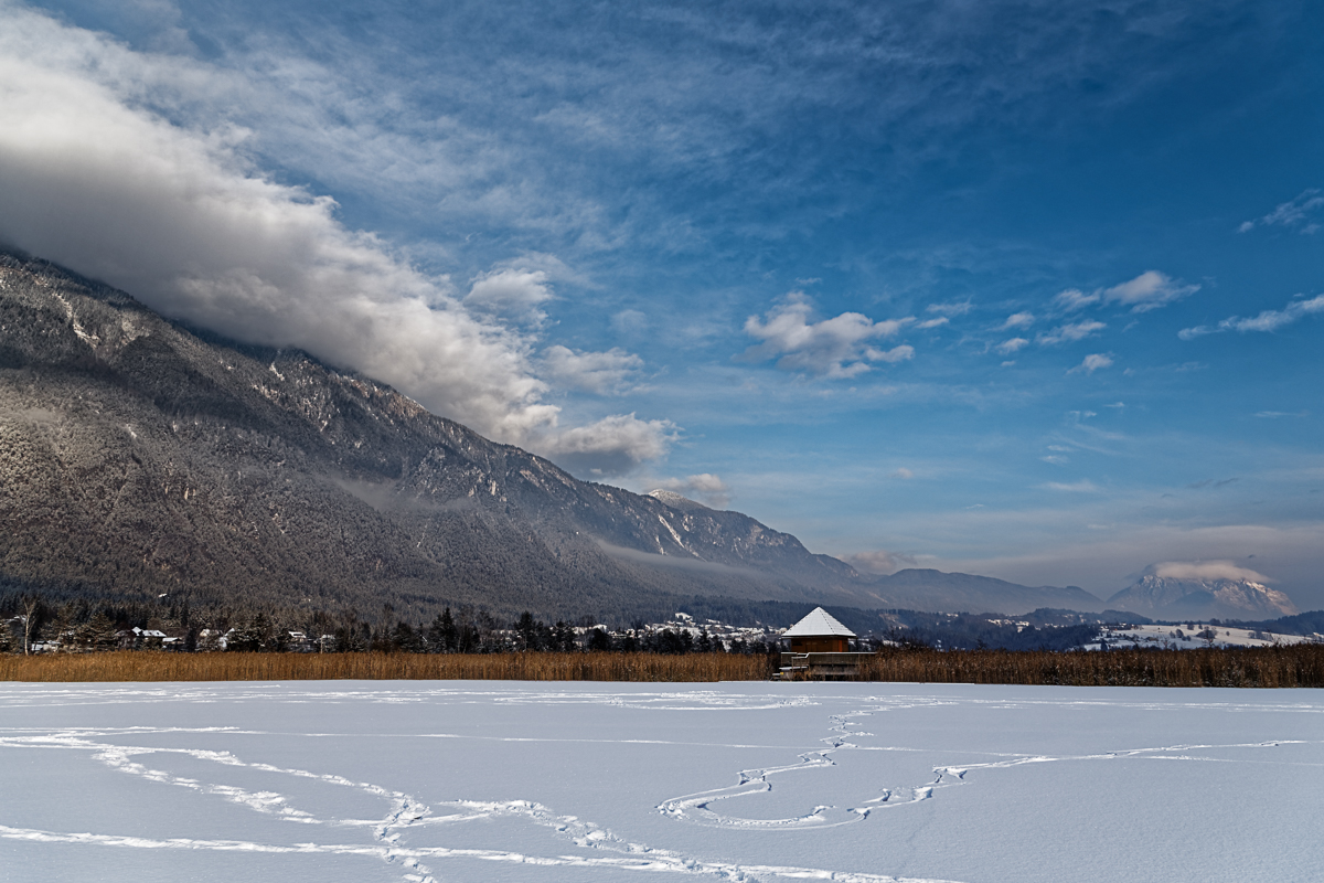 Auch dieses Jahr hatte ich das Glück, einen Spaziergang um den Pressegger See machen zu können. Besser gesagt auf dem Pressegger See, denn es gab eine dicke Eisschicht. Ich muss ehrlich geste­hen, dass ich bisher noch nie auf einem gefro­re­nen See unter­wegs war — ein mulmi­ges Gefühl, das sich aber schnell in Luft auflöst. 🙂