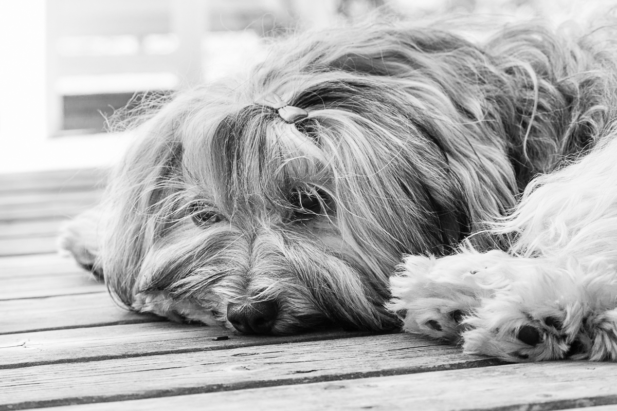 Emmi — immer noch eine süße Hundedame und jetzt schon richtig erwach­sen. Sie ist jetzt viel ruhiger und gelas­se­ner, was es für den Fotografen deutlich einfa­cher macht. Noch ein Jahr zuvor hätte ich entwe­der nur den blanken Holzboden erwischt oder einen Schnauzenabdruck auf der Linse riskiert… 😉