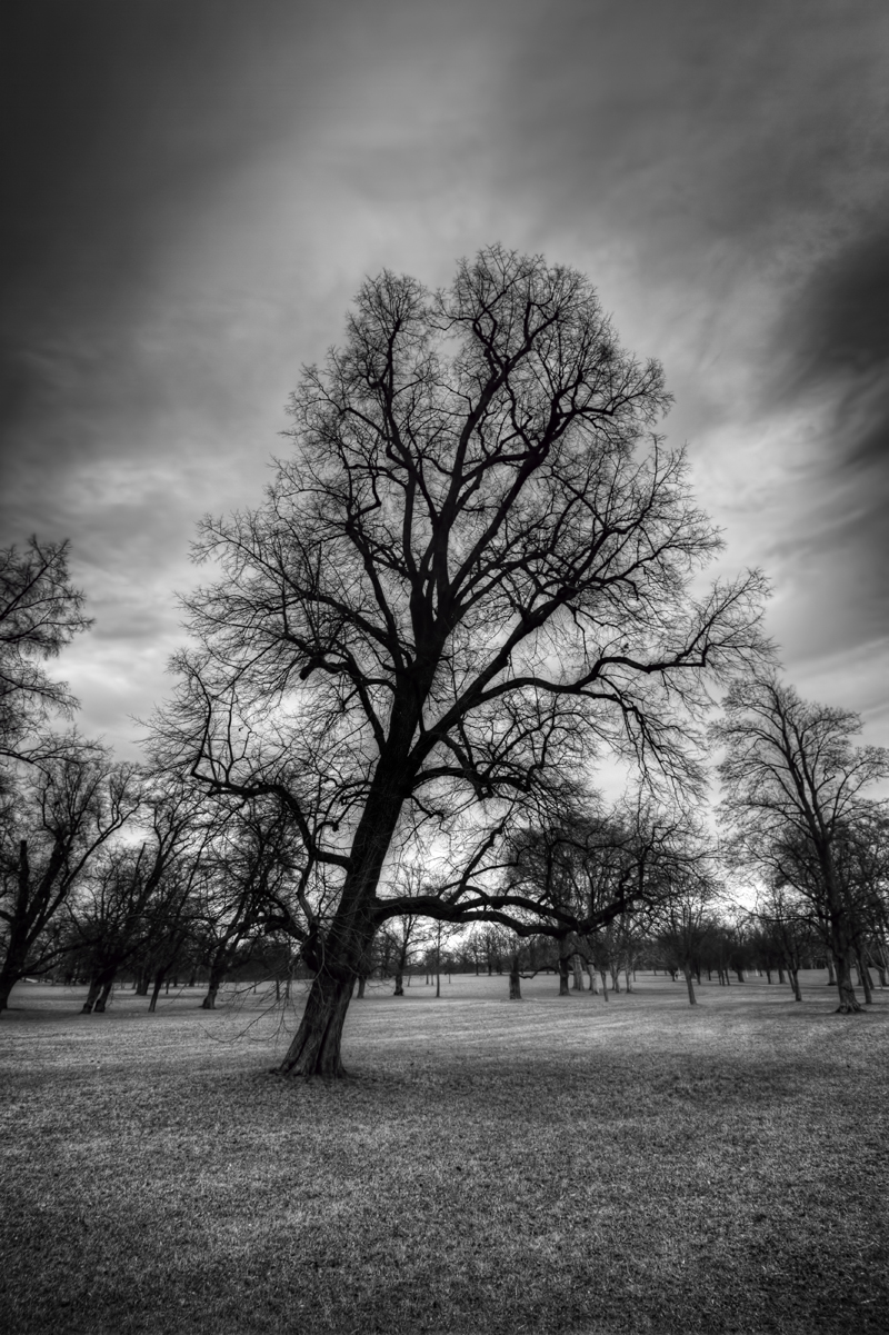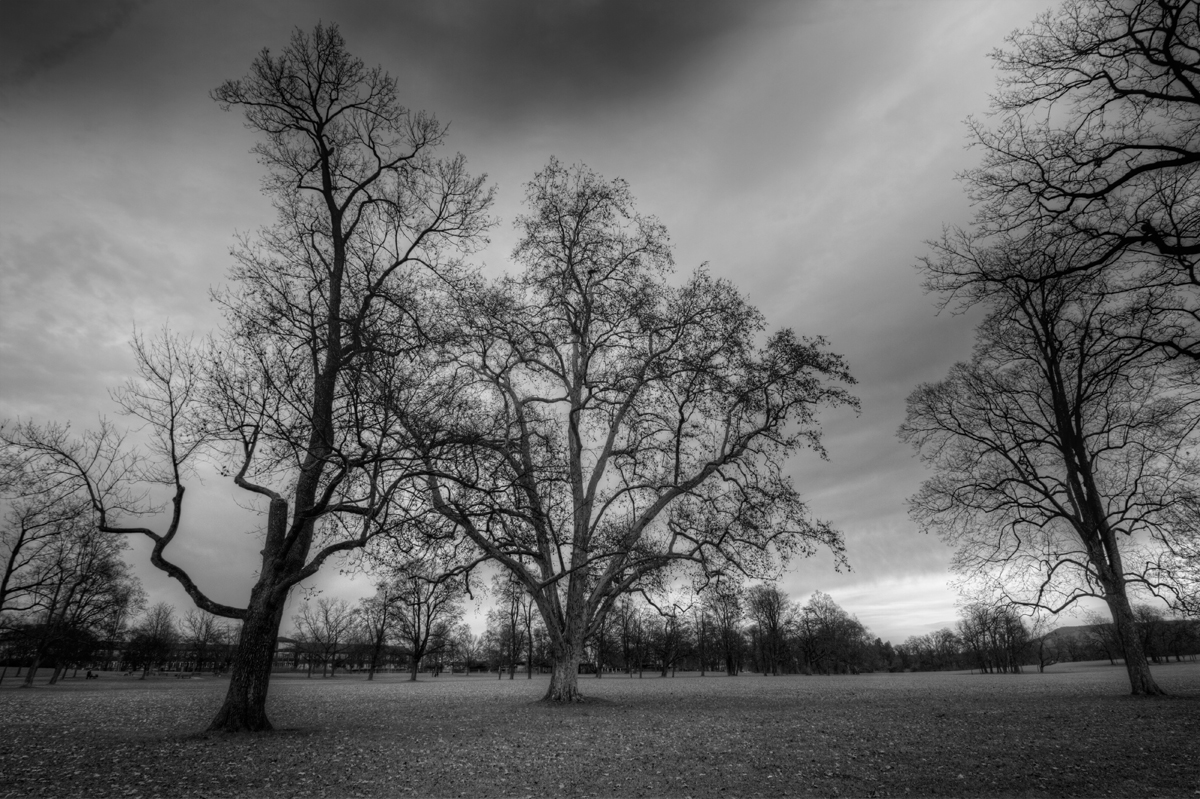 Im Rosensteinpark Stuttgart konnte ich diese Bilder kurz vor Einbruch der Dunkelheit erstel­len. Um die Stimmung besser wieder­ge­ben zu können, habe ich mich dazu entschlos­sen, ohne Farbe zu arbei­ten. Mit Hilfe von Photomatix Pro konnte ich die drama­ti­schen Lichtverhältnisse etwas verstär­ken. Das mittle­re Bild erinnert mich stark an den Gewitterbaum.